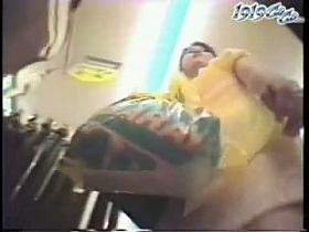 Asian brunette in a bookstore upskirt triple screen voyeur video