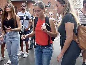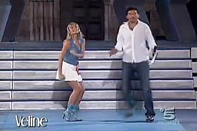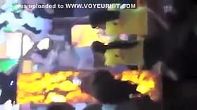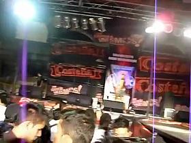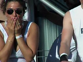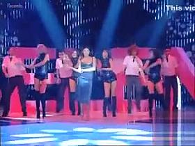 Raven-haired bombshell's jugs bust out of her shirt as she is dancing