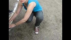 Sporty chick in tight spandex shorts