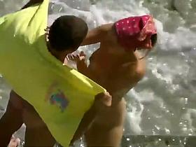 Nudist beach voyeur vid with two gorgeous brunettes all nake