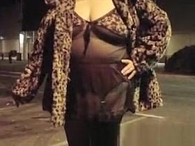 Exhibitionist in stockings and transparent blouse