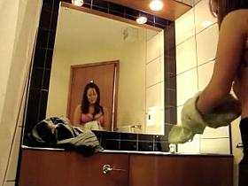 Ms Hayley B masturbating in a hotel bathroom she Squirts everywhere then licks her fingers