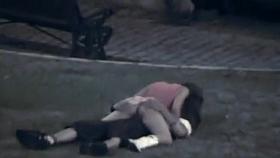 Dude fingers her cunt in park