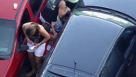 Sweet teenage brunette drives naked and pisses outdoors