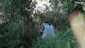 Redhead chick piss in the forest