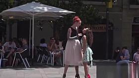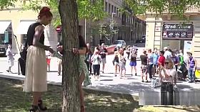 Sexy slave knows hot to work crowd in public