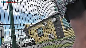 Upskirting thong footage of a brunette in mini skirt