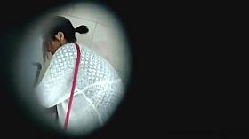 Hidden camera in the public toilet ceiling catches woman pissing.
