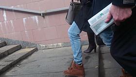 Russian girls in winter clothes gets taped while peeing in the street toilet