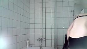 Skinny redhead with short hair, shows ass and takes a piss on a toilet