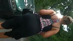 This busty blonde was having problems while holding her agitated rottweiler on the leash. Her big boobs were bouncing all over the place while that big dog jumped around and she struggled to contain him. There was even a bit of her nipple slipping out of that tiny white dress. You'll see it in slow motion too.