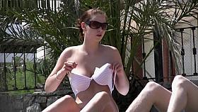 Hot body babe lying down on the beach surprised by a spy cam