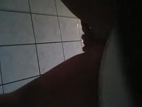 A brunette model goes to the pool bathroom to take a huge shit