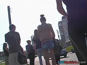 Gorgeous bombshell in high heels on upskirt camera