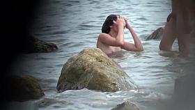Nude spy cam on the beach with a black hair goddess in focus
