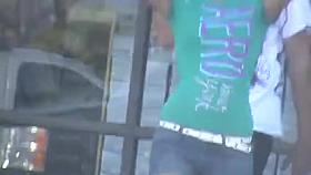 Short skirt of this brunette lassie looks nice, but the up skirt cameraman is more interested in her g-string.