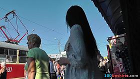 Skinny MILF talks with her girlfriend and didn't notice a quiet cameraman only in this unique up skirt video.