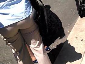 Sweet girl was shopping for groceries in the supermarket while voyeur tailed her from behind, checking out those hot curves of her ass in tights. Upon closer examination he also discovered her pantyline is showing and she is packing an obscure little thong in there.