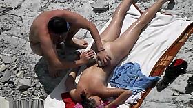 Voyeur. Guy wanking and fuck redhead girl on a public beach