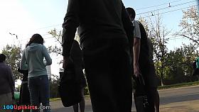 Curvy redhead parades her ass around town wearing a sexy little red skirt fluttering in the wind as she walks up the stairs, leaving her plump ass exposed to the eye of a hidden cam