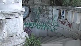 Her hands are tied behind her back as her mistress walks her down public streets and through squares, showing off the body of the slave and later giving her to guys for outdoor sex.
