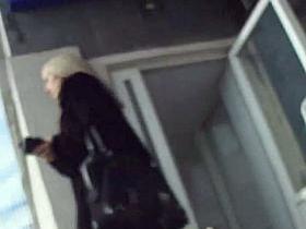 European woman is black stockings is standing while we watch her ass