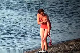 The downblouse girl becomes an object of a hidden spy cam on the beach