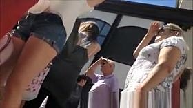 Rich Asian woman unaware of a street spy camera filming up her skirt. Her short white skirt quickly yields to a spy cam and reveals a matching white pair of panties covering her bulging pussy.