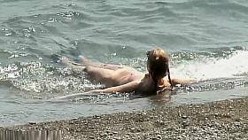 Blond with phat ass tattoos, pretty feet in the water.