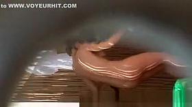 A spy cam in the sports club changing room takes the view of a milf's thighs and pussy