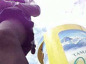 Wife Dressed Like A Slut In Stockings Miniskirt and High Heels Flashing Her Cunt