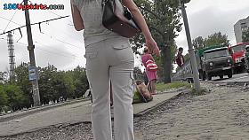 Awesome bum is filmed walking through summer streets