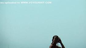 Black amateur with big breasts in voyeur shower scene