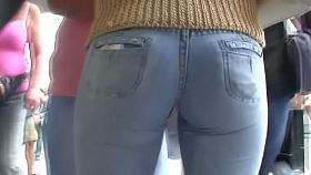 Brunette with a juicy ass in jeans followed by a candid cam voyeur