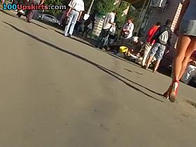 Voyeur mingled in a big crowd of people and he paid special care to stand near women in short skirts. He took many peeks on their upskirts and he collected a bunch of sexy sighs on their asses. Many girls are very thongs so it looks as if they are nude under the skirts.