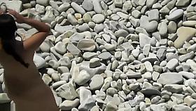Voyeur in a public place caught a mature milf in the lens, who masturbates outdoors with a banana. Nudist with big tits, fat ass and hairy pussy.