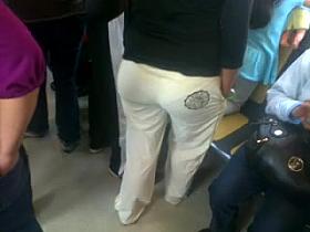 College girl was hanging out in the park with her friends and they were all sitting on the grass. Voyeur zoomed in from further away because he noticed that a purple thong slipped out of her pants. I wonder if her mates realized it and what they thought of it.