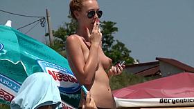Nudist teen with hairy pussy reads naked at the beach
