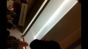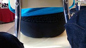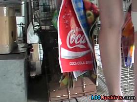 Sexy brunette chick with ponytail in short pink dress upskirted in the shopping mall stairs.