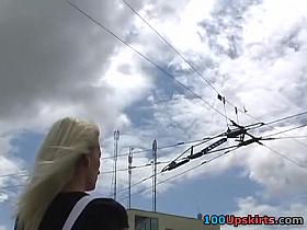 Blond in cute outfit flashing upskirt belt