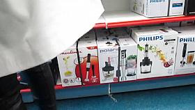 Woman wearing stockings and white panties upskirted in the supermarket.