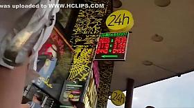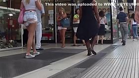 When you see the kind of tights this sexy blonde is wearing, you'll realize why my candid camera was filming her all the time. I filmed her sexy appearance in the cosmetics store and those torn tights fitted her big butt very nicely. I also filmed another hot woman in tight black pants.