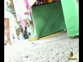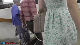 Long hair woman in white short dress upskirted in the rolling stairs and as she walks has nice ass and crotch.