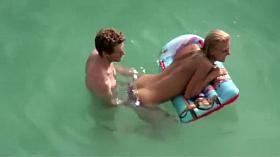 Topless woman rides nude man in shore