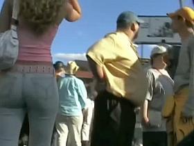 A hefty xxxl woman in a street candid video walks in tight black jeans