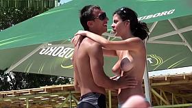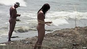 Nude woman strokes her man's penis at beach