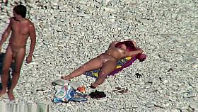 Nude blonde wearing a baseball cap displays her tits on the beach