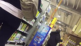 Girl in dark flower pattern leggings walking around shopping mall with her butt cheeks jiggling as she walks.