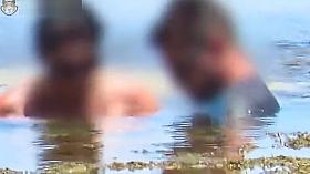 Two nudist women laid down by the water