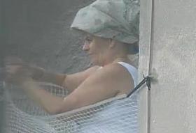 Babe washing her big boobs down blouse on a hot day